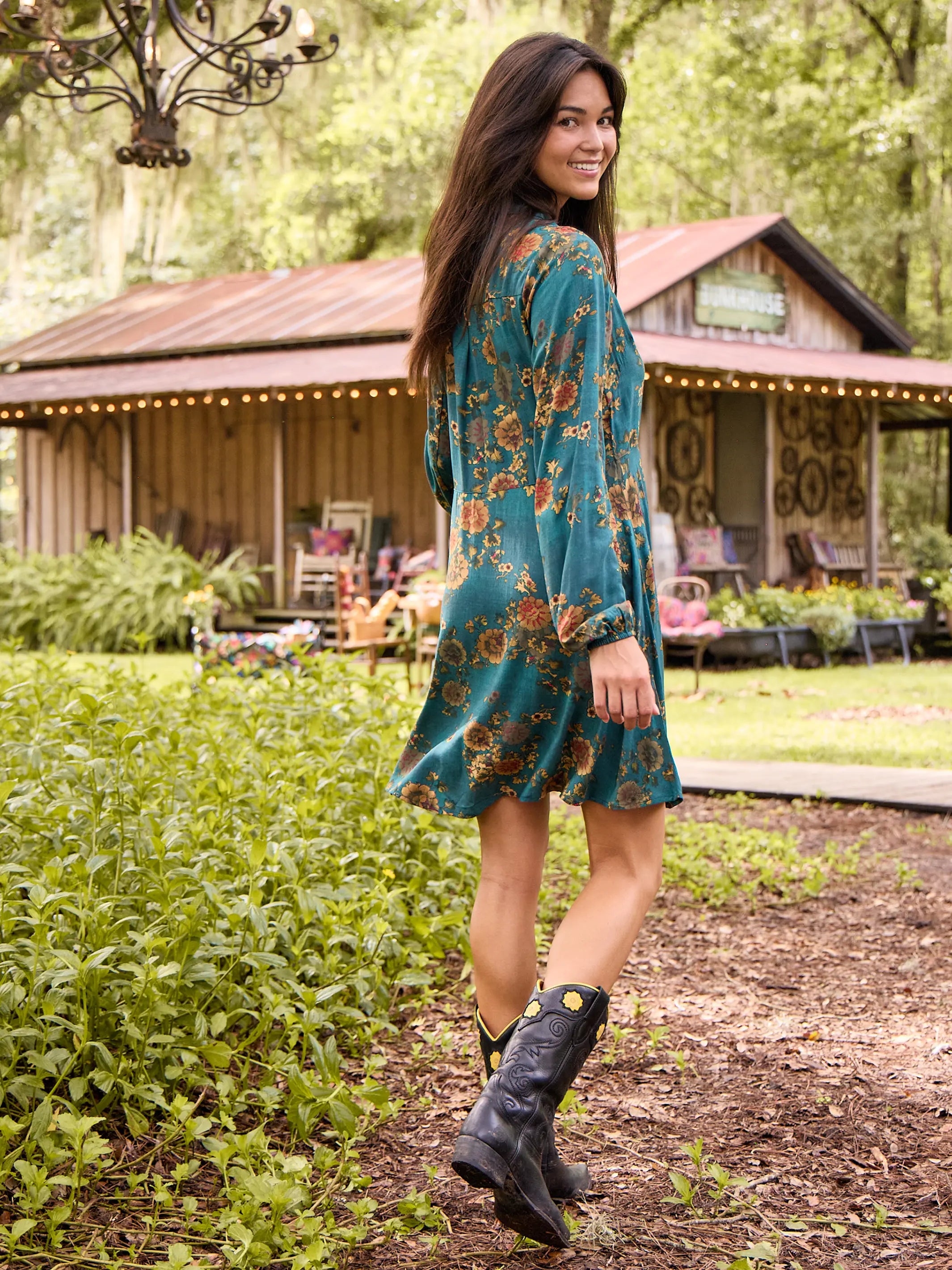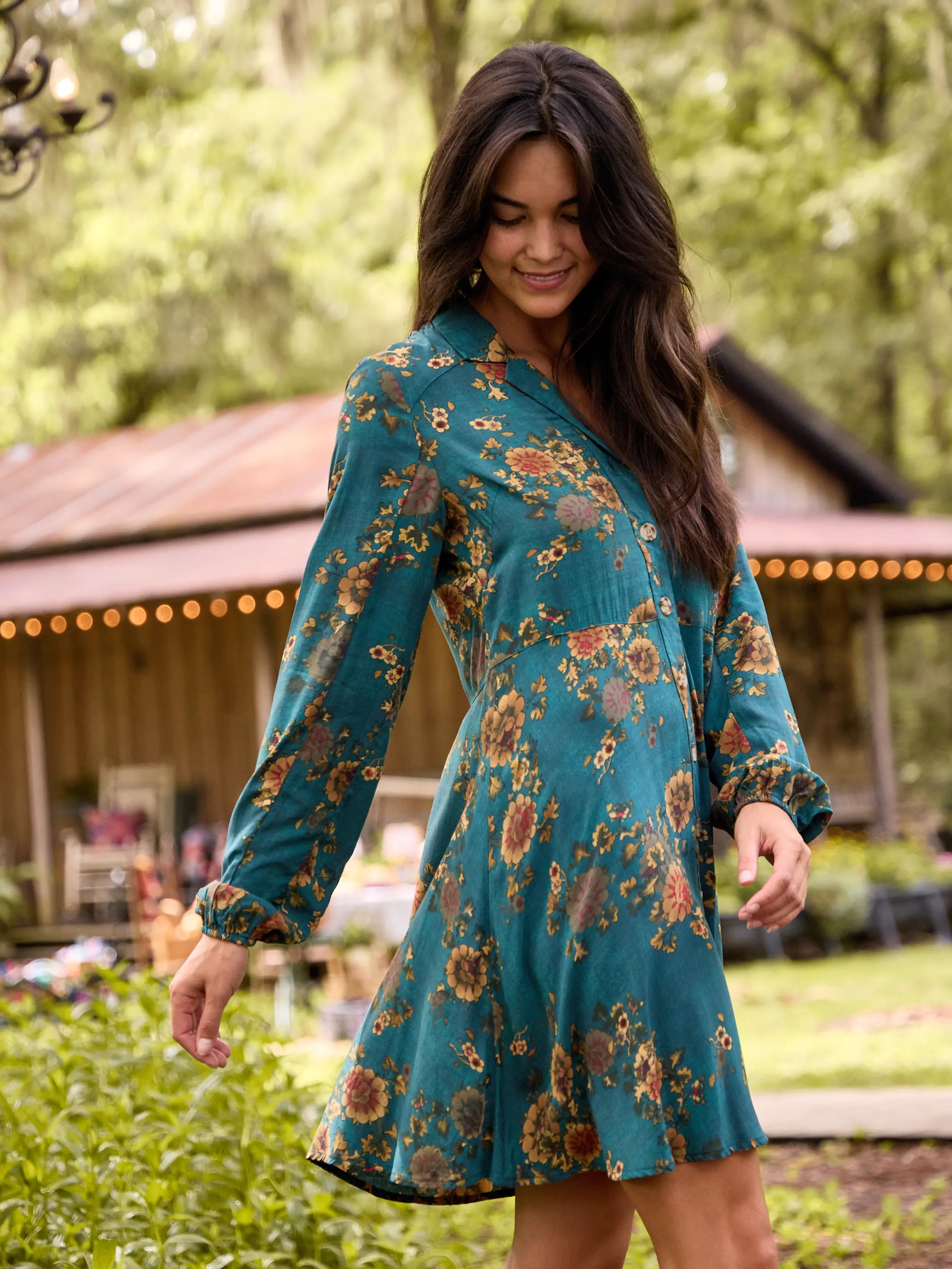 Ansley Woven Tunic Shirt Dress - Teal Orange Clusters