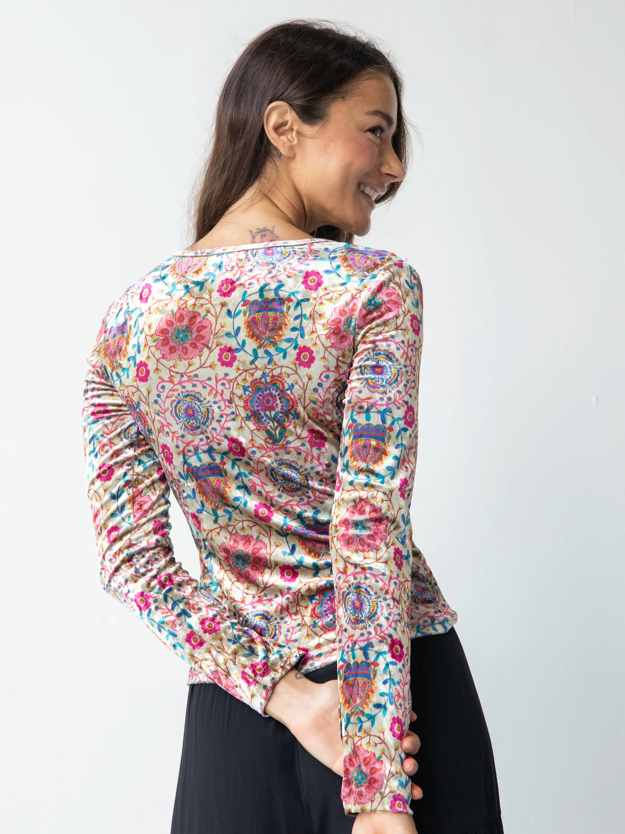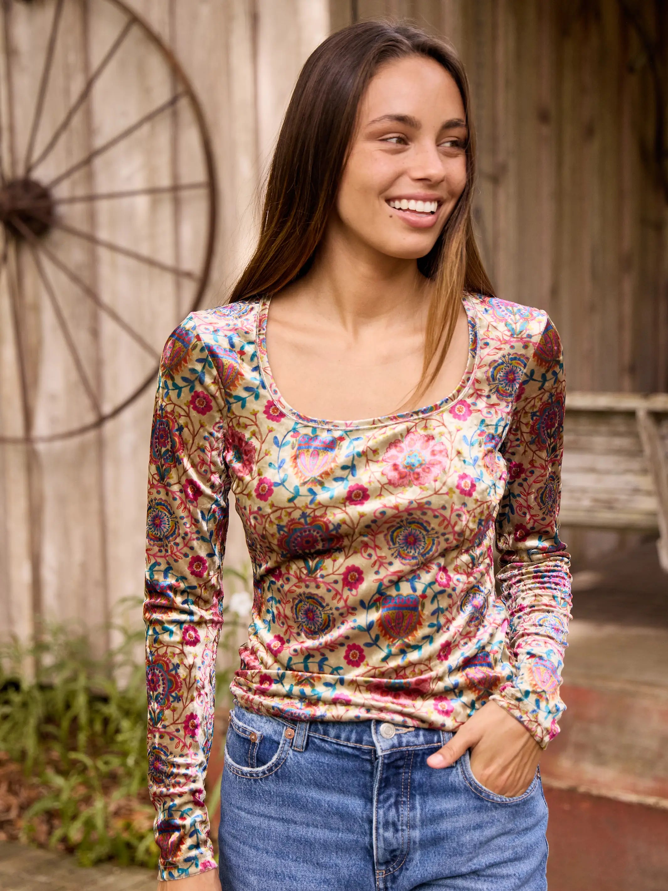 Danielle Square Neck Velvet Top - Black Printed Folk Cream