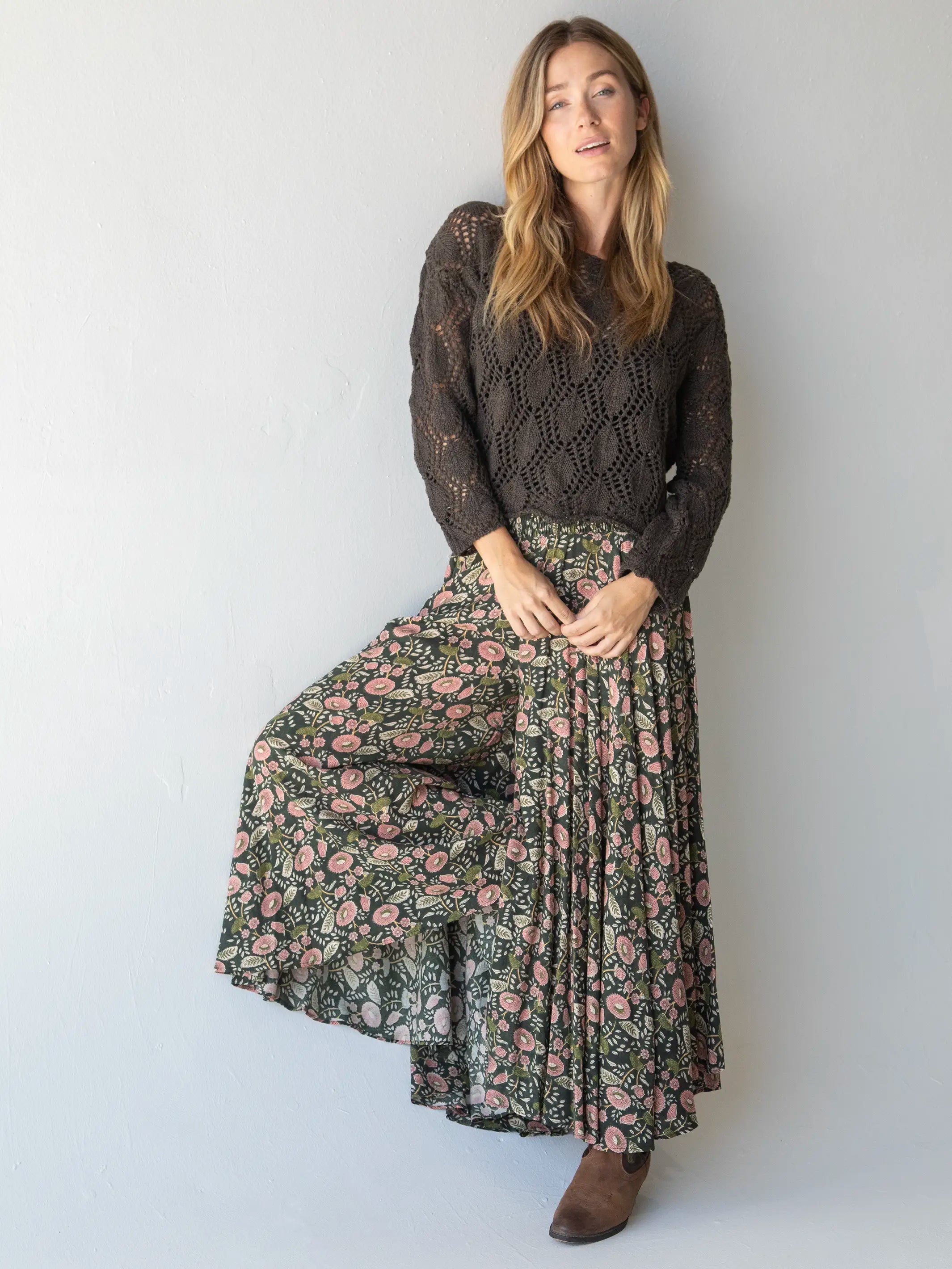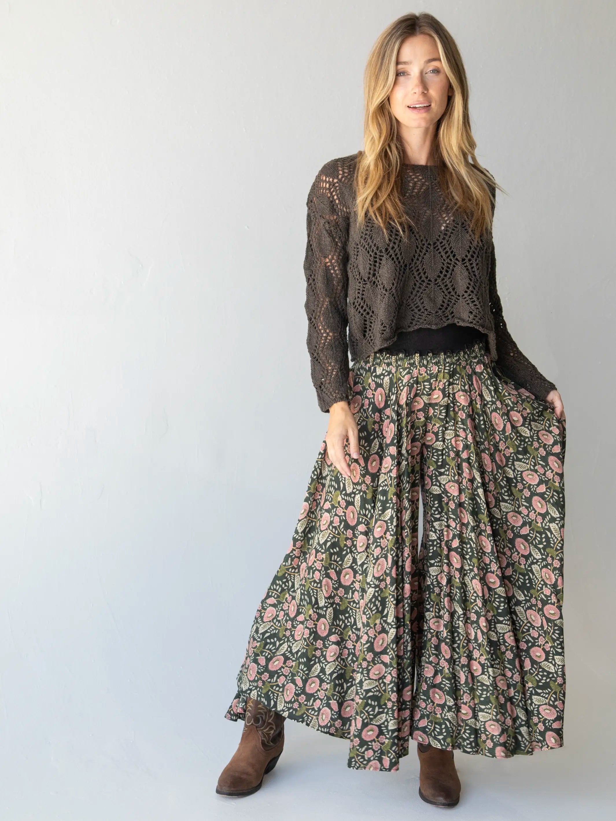 Wanderlust Palazzo Pant - Dark Green Pink Floral Vines