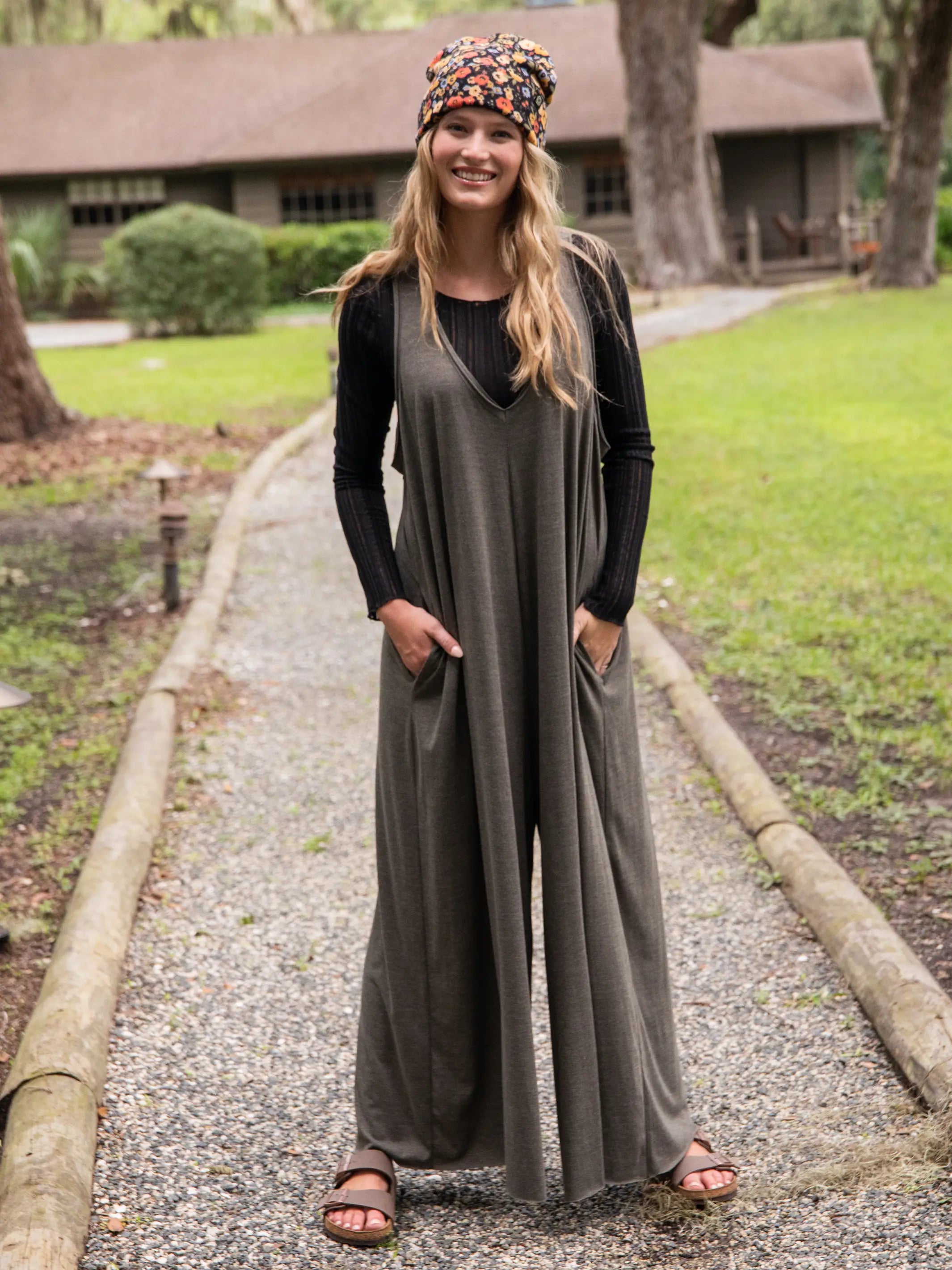Knit V-Neck Jumpsuit - Olive