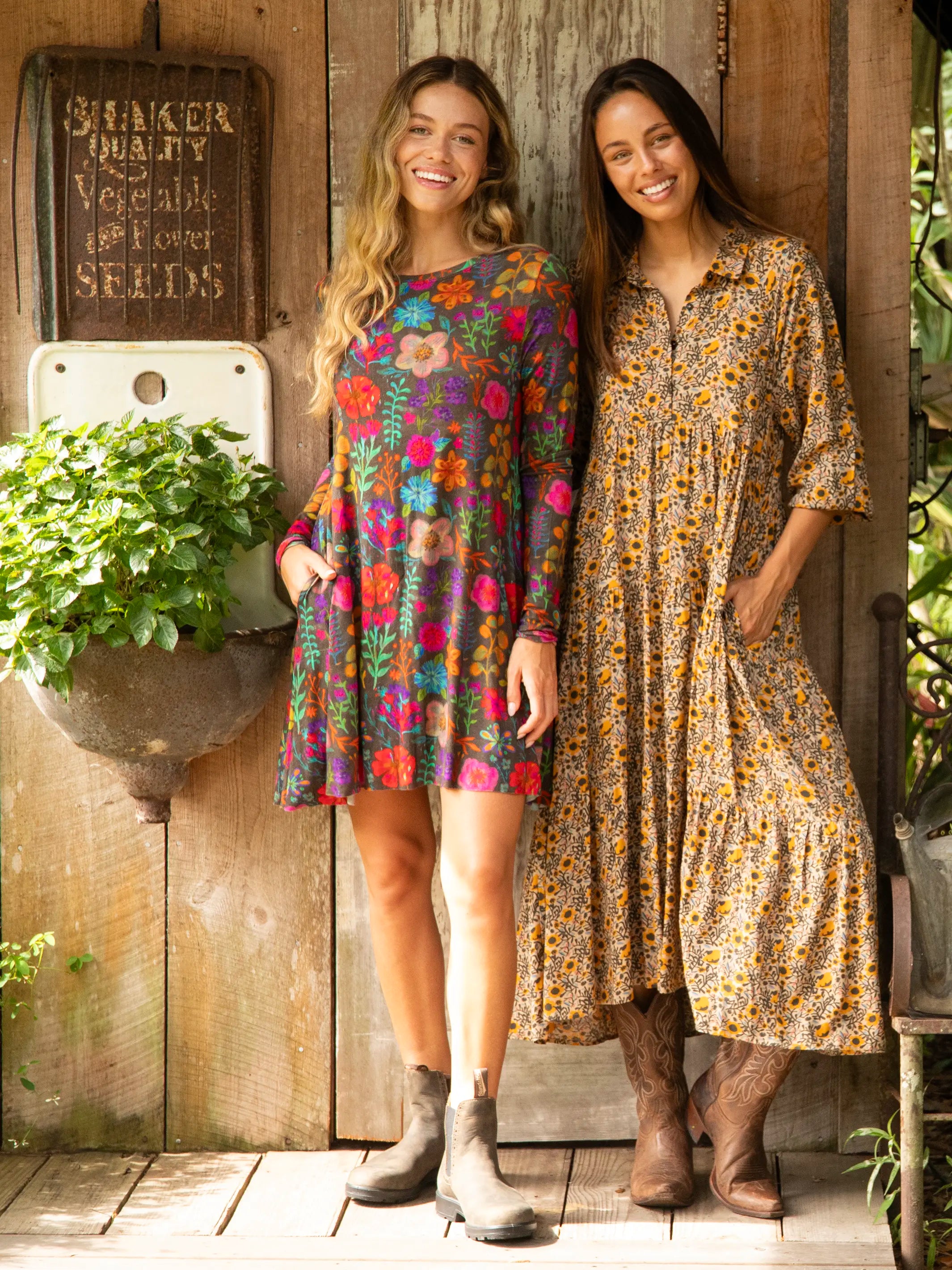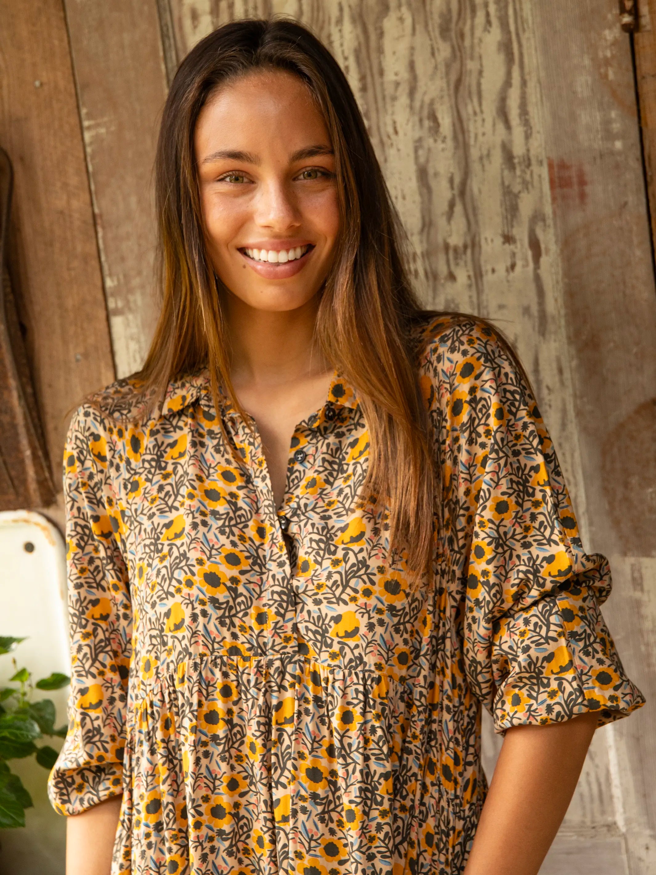 Rebecca Long Sleeve Midi Dress - Cream Yellow Sunflower